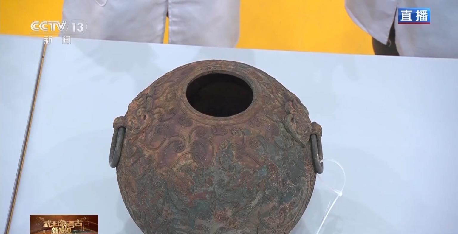 首次發(fā)現(xiàn)的這件鋪首銜環(huán)球形三足甕,目前歸為盥洗器,但其功用暫不清楚。上面有精美的勾連云紋,立體感十足。