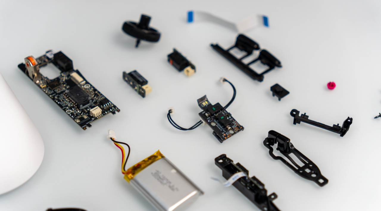 整只鼠標(biāo)除了上下蓋之外,核心元件均集中在底部條狀PCB和中框小板上。