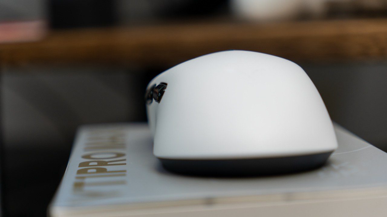 鼠標(biāo)背部曲線繼續(xù)沿用VT9系列的設(shè)計,背部背部中心出現(xiàn)在鼠標(biāo)正中央,而且從后面可以看到, 鼠標(biāo)的背部并不像其他鼠標(biāo)那樣呈一個弧形,而是更接近一個平面。這個設(shè)計讓鼠標(biāo)在趴握時對掌心的支撐面更大,同時沒有太強(qiáng)的頂手感。