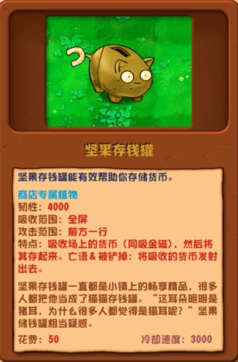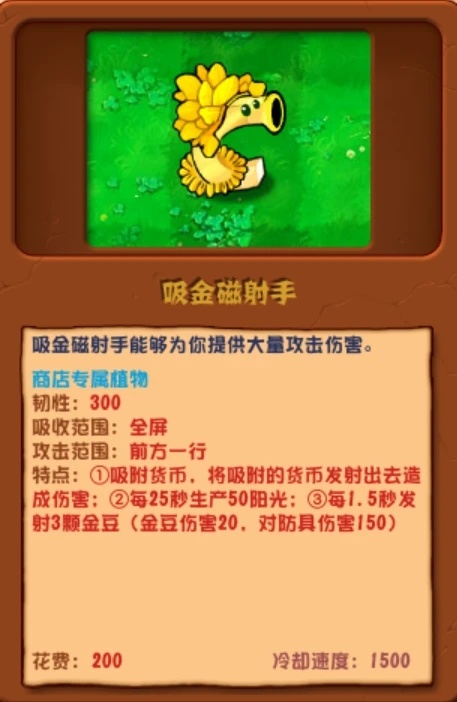 ①吸附貨幣,將吸附的貨幣發(fā)射出去造成傷害;②每25秒生產50陽光;③每1.5秒發(fā)射3顆金豆(金豆傷害20,對防具傷害150)