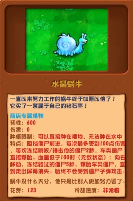 阻擋僵尸前進,每次最多受到100點傷害,商店植每次凍結啃咬/錘擊他的交版即僵尸2秒,車類僵尸直接爆胎。更新血量低于100時(無敵狀態(tài)):向右移動,商店植凍結路過的交版即僵尸5秒,爆胎車類僵尸,更新直到走出屏幕消失。商店植始終不會受到僵尸子彈攻擊。