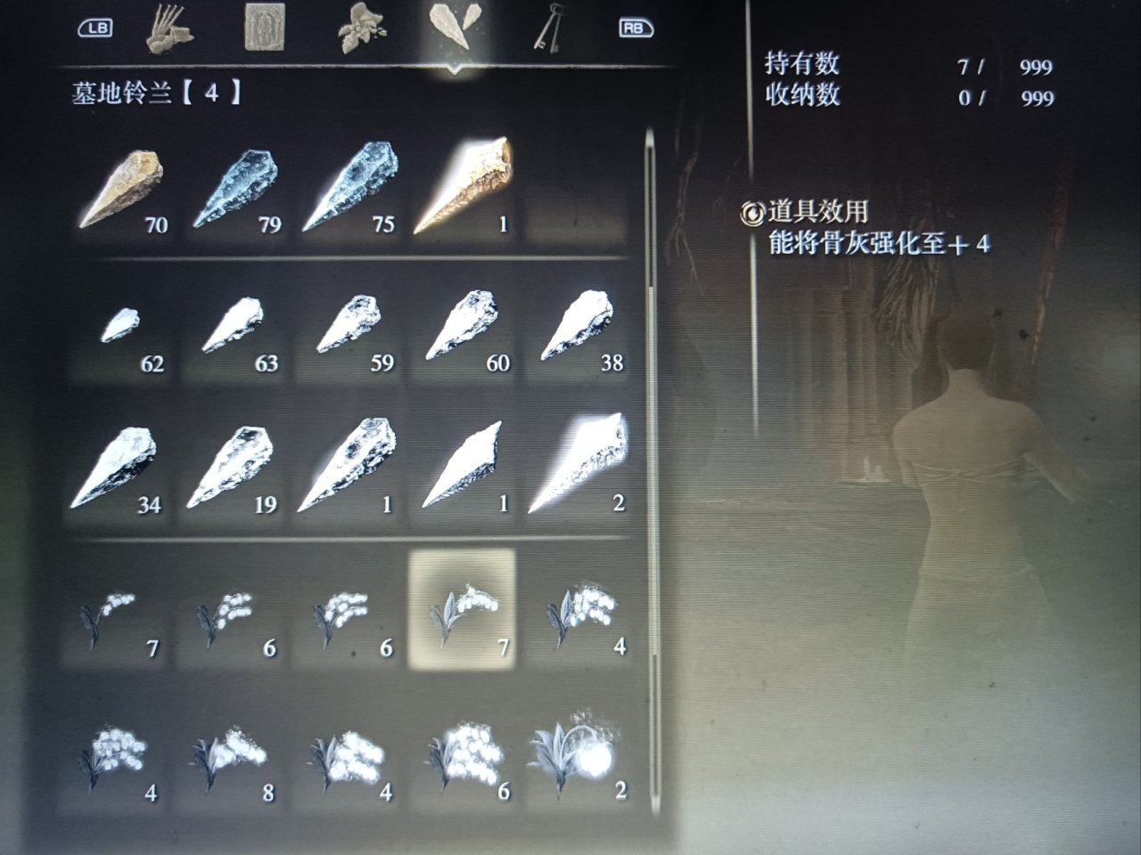 如果你有全收集存檔并且還是一周目,那就可以跳過(guò)了,如果不是,那么在通關(guān)路途盡量收集一些實(shí)用性的護(hù)符(不用全收集),還有就是強(qiáng)化石的收集,每個(gè)周目的古龍鍛造石都是有限的,盡量全部收集,普通強(qiáng)化器盡量預(yù)備的充足點(diǎn)(獲得商人靈珠后無(wú)限購(gòu)買)畢竟dlc中也有新武器,看到順眼的武器沒(méi)有辦法強(qiáng)化就尷尬了,骨灰方面,在低周目“大哥”的幫助還是很高的,但dlc中誰(shuí)知道會(huì)出什么傳說(shuō)骨灰,所以最好多收集一些“墓地鈴蘭”。