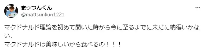 日本網(wǎng)友們討論起其中的原因。許多人就認(rèn)為,最初提出麥當(dāng)勞理論的是新西蘭人Jon Bell,或許這代表麥當(dāng)勞在新西蘭的外食文化當(dāng)中地位低落,所以理論才能夠成立。然而在日本,麥當(dāng)勞卻被認(rèn)為是便宜又好吃的外食之一,所以才會(huì)導(dǎo)致這套理論在日本不適用。