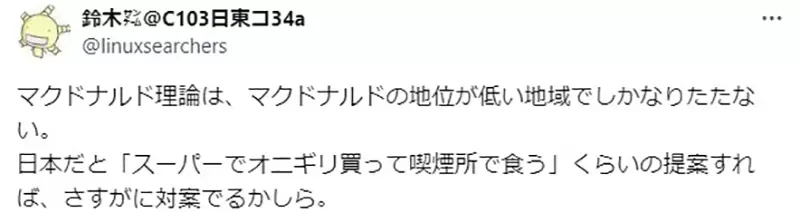 麥當(dāng)勞理論只有在麥當(dāng)勞的地位比較低落的地區(qū)才能夠成立。換作日本的話,應(yīng)該要改成『不如我們?nèi)コ匈I(mǎi)飯團(tuán)然后去吸煙區(qū)站著吃』之類的,這樣人家肯定會(huì)提出其他意見(jiàn)吧。