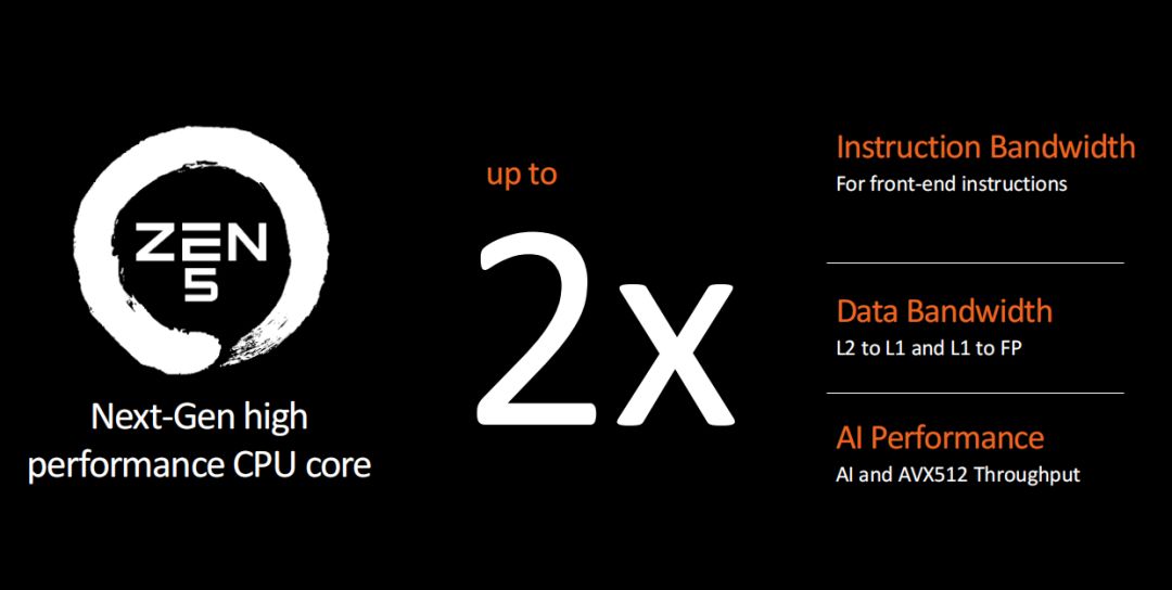 此外,Zen5架構(gòu)還相對Zen4提升了前端指令的帶寬、二級緩存到一級緩存/一級緩存到浮點單元的數(shù)據(jù)帶寬、AI與AVX512的吞吐量,最高的提升幅度可達兩倍。