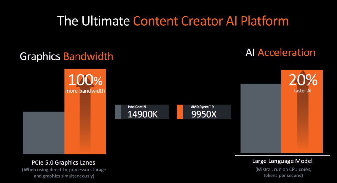 此外,AMD還給出了銳龍9 9950X與酷睿i9 14900K在AI應(yīng)用中的性能對比。左邊是同時使用獨顯和處理器直出M.2 SSD時可以提供的顯卡接口帶寬,畢竟在使用獨顯進行AI計算時,處理器提供的PCIe帶寬性能是很重要的。在這個項目中,由于銳龍9 9950X可以同時給M.2 SSD和顯卡提供足夠的PCIe 5.0通道數(shù)量,所以領(lǐng)先了酷睿i9 14900K一倍(畢竟酷睿i9 14900K只有16條PCIe 5.0通道,無法同時提供給PCIe×16的獨顯和PCIe×4的M.2 SSD)。右邊是使用處理器運行大語言模型,銳龍9 9950X的性能也要高出酷睿i9 14900K大約20%。