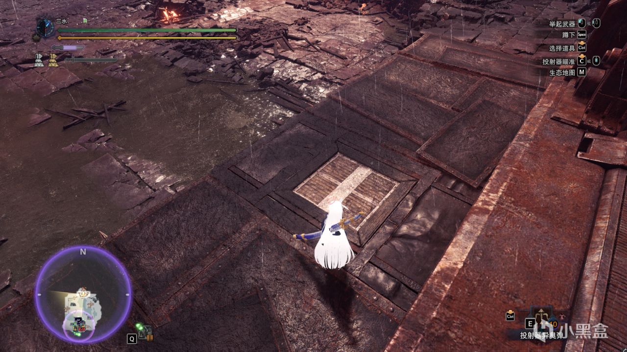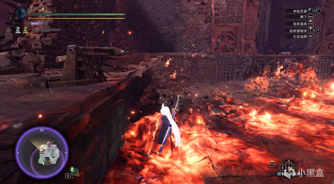 進入P3后,我的習慣是打開閘門到如圖的位置飛撲來躲避黑龍怒吼的判定(也可以用不動衣裝或者翻滾,翻滾容錯率比較低),主動起身爬上去,將弩箭切換為拘束彈,等黑龍轉向我們,對著黑龍發(fā)射。
