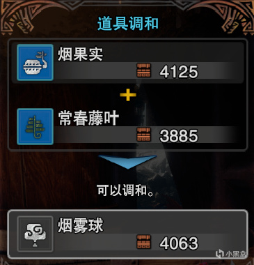 攜帶道具上,不同于常規(guī)怪物的一個道具就是煙霧球,調和材料是煙果實和常春藤葉,其次沒有什么好說的。