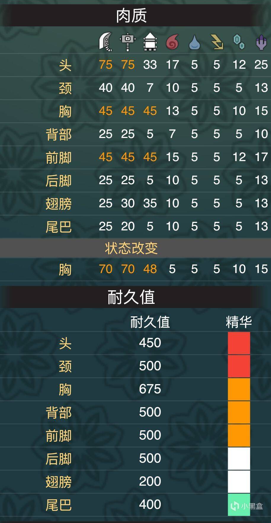 對于近戰(zhàn)武器:頭部肉質75,胸和前腳是45,脖子是40,其它部位過低,不詳細說明。比較特殊的是三階段后胸部肉質提升至70。由于黑龍要求我們破頭的機制,盡量多對頭部輸出,每次破頭三階段傷害都會有些降低,否則三階段為藍火狀態(tài),傷害極高。對于遠程武器:頭部、胸部肉質分別為33和45,三階段胸部肉質提升到48,另外遠程武器對黑龍頭部造成傷害無法吃到弱點特效的會心加成,故主要打胸,遠程武器打黑龍又稱為藍火黑龍房,極易暴斃,遠程武器玩家要有個心理準備。