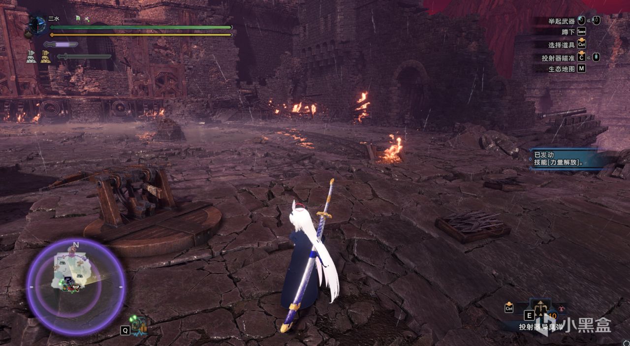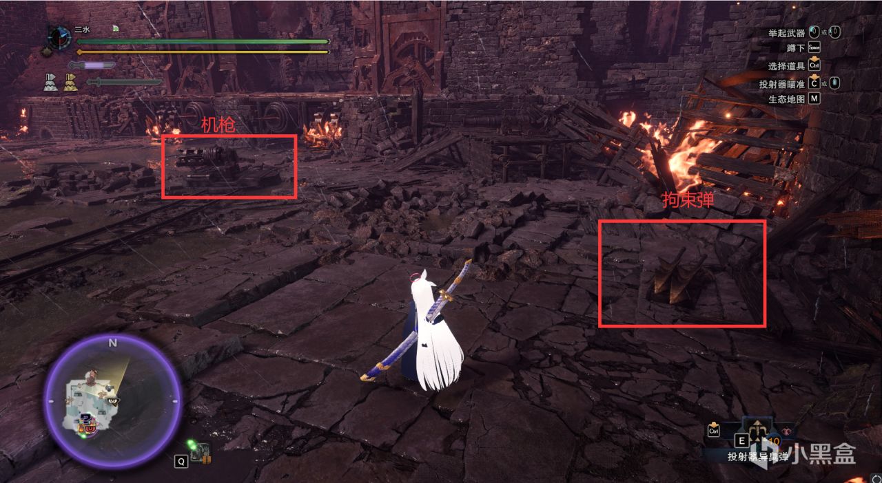 這里只討論最常見的場地器械使用流程,另外要說一下我有點懶狗了(私密馬賽),就不深入講黑龍的器械倒地了,我也沒搞太清楚這方面。前文攜帶的炮擊手二該起作用了,在進入P2后,轉身撿到一顆拘束彈,穿上轉身衣裝,在機槍位置扔一顆煙霧球,上機槍,對著黑龍的胸部biubiubiu,只要黑龍?zhí)幱谶M怒或是胸部軟化且沒打太歪,基本上可以一輪機槍打出器械倒地,既是進怒又有胸部軟化就更不用說了,如果沒有打出倒地,就到下圖的位置撿弩箭并補射幾發(fā)就倒地了。