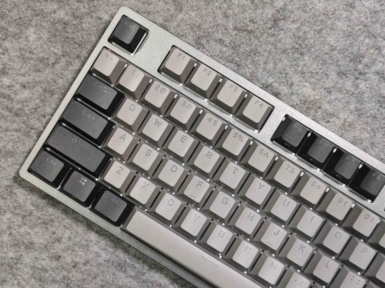 鍵盤的配色為深空灰,面殼為PC材質(zhì),只是表面噴了金屬噴漆,并做了磨砂處理,所以看上去非常有一種沉穩(wěn)大氣的感覺,摸上去質(zhì)感也非常棒細(xì)膩且親膚,顏值方面非常到位。