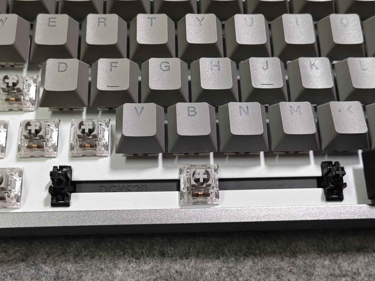 軸體方面,K320目前有貨的版本一共有三種軸體:杜伽定制茶軸、杜伽定制銀軸及杜伽定制靜音紅軸,軸體都支持熱插拔。我手上這個(gè)是定制銀軸版本,看了一下是凱華的軸,而銀軸大家都知道,鍵程段,加長(zhǎng)的彈簧及軸心使得他能夠非??斓赜|發(fā)按鍵,這就注定了這是一款非常適合游戲的線性軸。并且軸體還有防塵壁,能提升軸心的穩(wěn)固性,使得按鍵更加穩(wěn)固不松散。