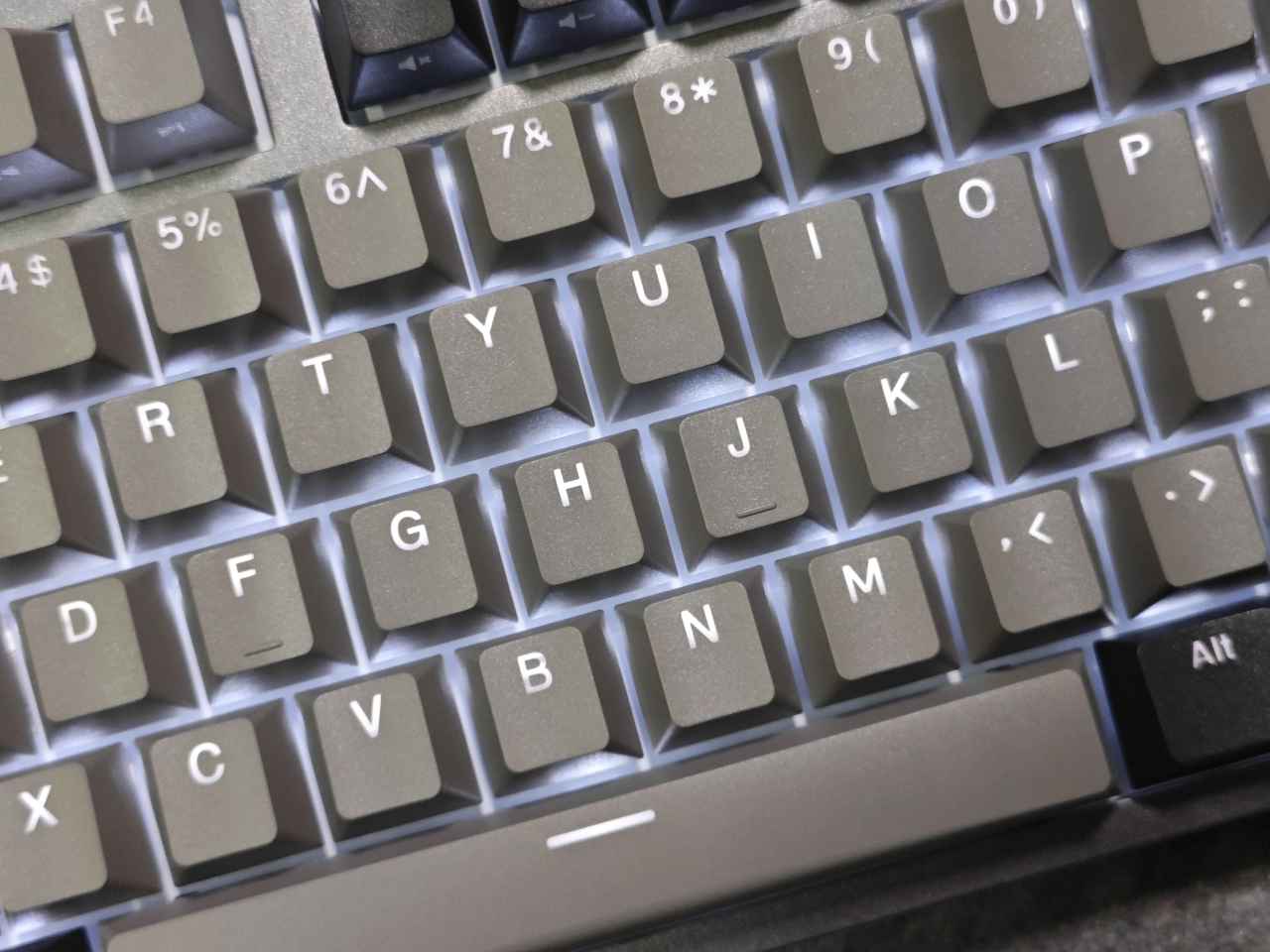 K320的鍵帽采用原廠高度的PBT雙色閉口字體鍵帽,并且為字符透光的設(shè)計(jì),鍵帽為黑色+深灰的組合,非常高級(jí),并且是我最喜歡的原廠高度,打字體驗(yàn)非常舒服。