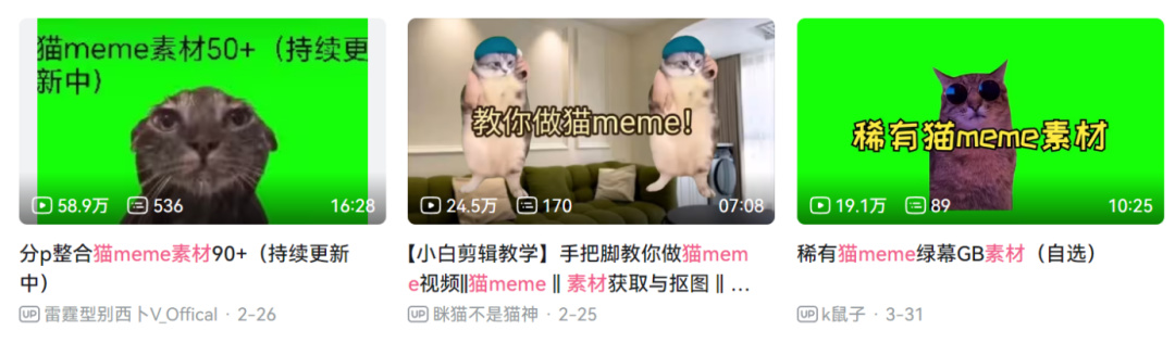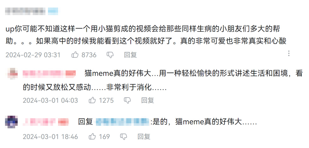 并且,由于大家已經(jīng)熟悉和了解貓meme中不同的小貓形象所代表的情緒,因此他們能夠快速地理解作者想要傳遞的情感,對視頻的情緒閾值有所預(yù)期。這種情緒上的可控感和熟悉感也讓觀眾能更無負(fù)擔(dān)地點開這些貓meme視頻。