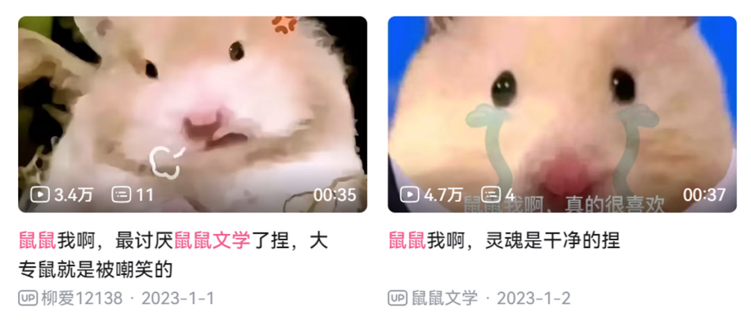不過,相較于貓meme視頻的強敘事性和豐富的動態(tài)表現(xiàn),大多數(shù)鼠鼠文學(xué)視頻僅僅以是靜態(tài)圖片+文字的形式呈現(xiàn)。