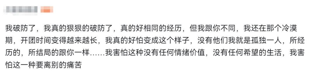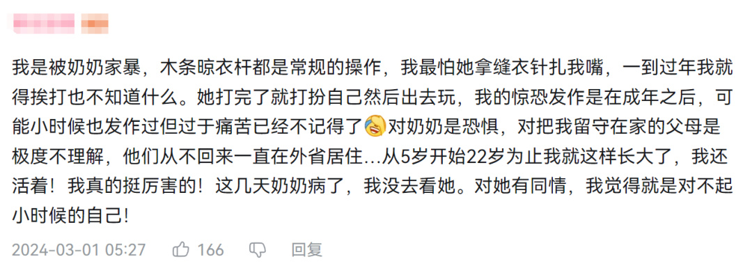 對個體自身而言,其創(chuàng)傷的成因與撫養(yǎng)者不允許其表達脆弱和情緒是相輔相成的,這也導(dǎo)致了他們恥于表達情緒和需求。而在公共平臺上展示自身(特別是負(fù)面的)經(jīng)歷,很有可能招致二次傷害,并讓當(dāng)事人陷入“如果當(dāng)初不說出來,是不是反而不會招來陌生人的傷害”的自責(zé)心情,和自己是不是在博取眼球和同情的自我懷疑。