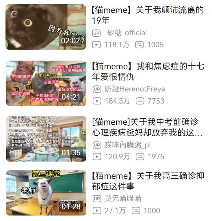 并且,鼠鼠文學(xué)的創(chuàng)作與受眾主體是即將或已經(jīng)進入社會的成年人,貓meme的創(chuàng)作者則不少是還在上學(xué)的青少年。這彼此之間也體現(xiàn)了受眾主體代際的經(jīng)歷差異,和創(chuàng)傷在不同年齡階段對個體影響的強度差異。