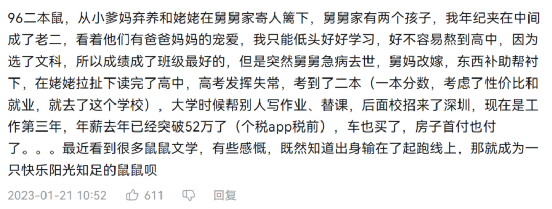 用鼠鼠自嘲的這代人能夠意識到自身的經(jīng)歷并不是因為自己本質(zhì)上無能,而是未能達成社會期許的外部條件(學(xué)歷、家境、外貌……)造成。并且大多數(shù)進入社會的成年人,相較于未成年的學(xué)生,存在脫離原生家庭的條件,有一定的能夠作為外部支援的社會網(wǎng)絡(luò)。