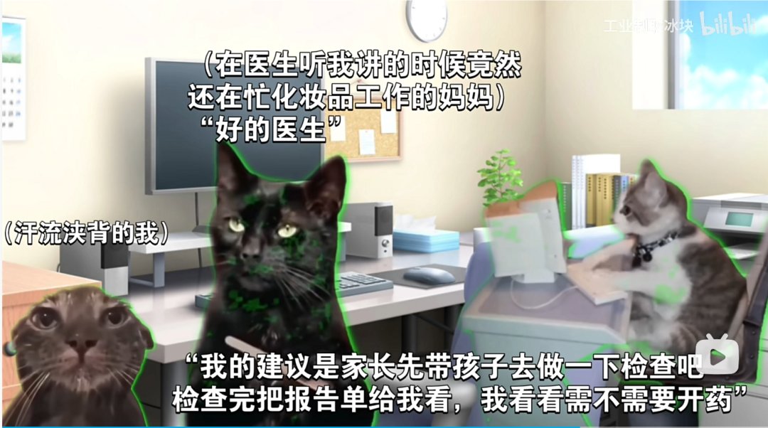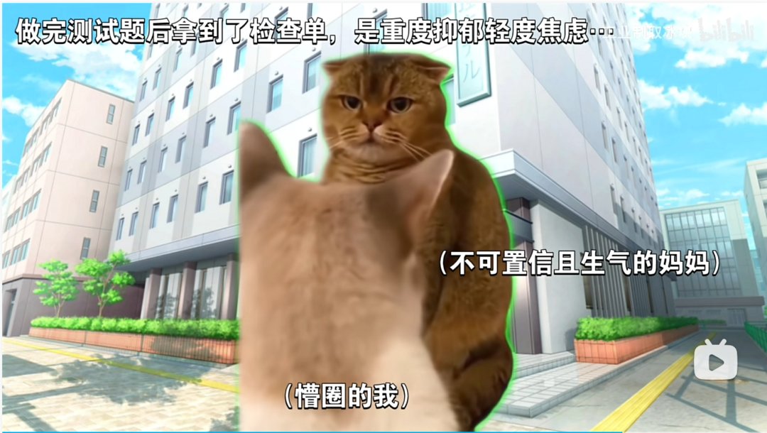 如 【[貓meme]關(guān)于我中考前確診心理疾病爸媽卻放棄我的這件事】這個視頻中,up主通過重述自己去醫(yī)院診斷的經(jīng)歷中母親的反應(yīng)(忙于工作、連子女生病都吝于表達關(guān)懷),意識到本該是撫養(yǎng)者的家人并不關(guān)心自己。