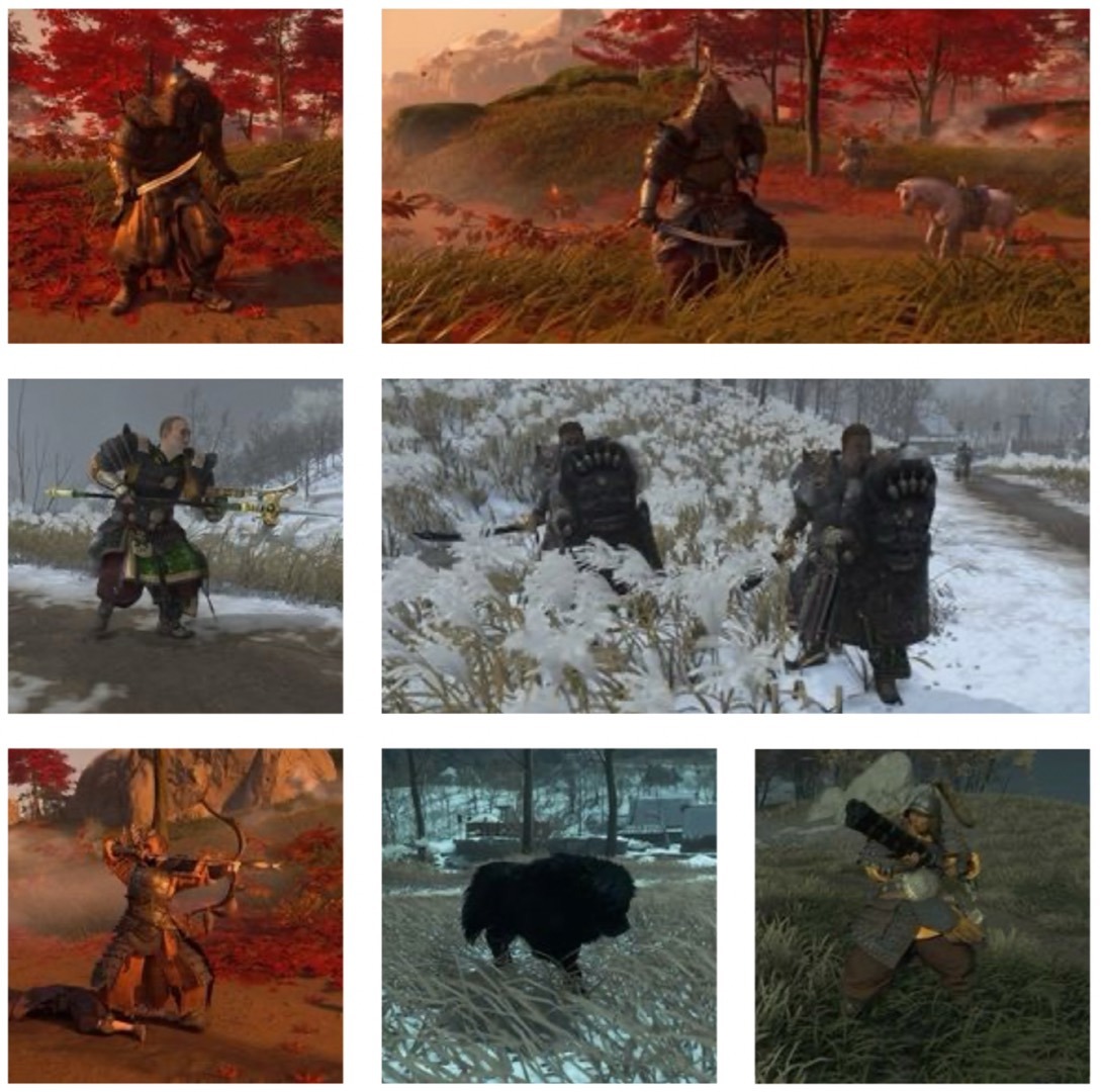 一款優(yōu)秀的開放世界游戲,必然離不開對“世界”的理解,玩家在這片廣袤的區(qū)域中活動,視覺上的感受是最直接的,好比很多“罐頭”游戲為什么明明不好玩但是還是吸引了很多玩家去玩呢?很大一部分就是奔著風(fēng)景去的,其中的佼佼者當屬“育碧”家了,當然我覺得“地平線”系列和“霍格沃茨之遺”的風(fēng)景也很不錯。那么《對馬島之魂》又有什么優(yōu)勢呢?其實這游戲非?!巴倒p料”,素材復(fù)用到離譜,花草樹木千篇一律,男女老少基本上來來去去就幾張臉,但《對馬島之魂》非常會營造氛圍感,金黃的落葉、搖曳的稻草,配合“武士”這個題材非常有感覺,尤其是每次任務(wù)開始和結(jié)束時的定格分鏡,契合任務(wù)主題的同時也在刻畫主角心態(tài),足見制作者對日本藝術(shù)美學(xué)有著很深的理解。