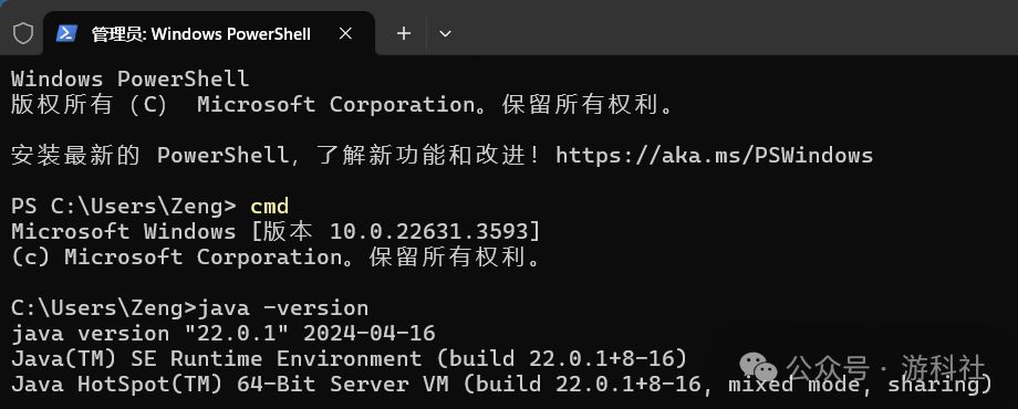 win+r打開終端管理員,輸入cmd,再輸入 java -version,就可以查看安裝的java版本了,我的java版本截圖如下,可以看到是Java22