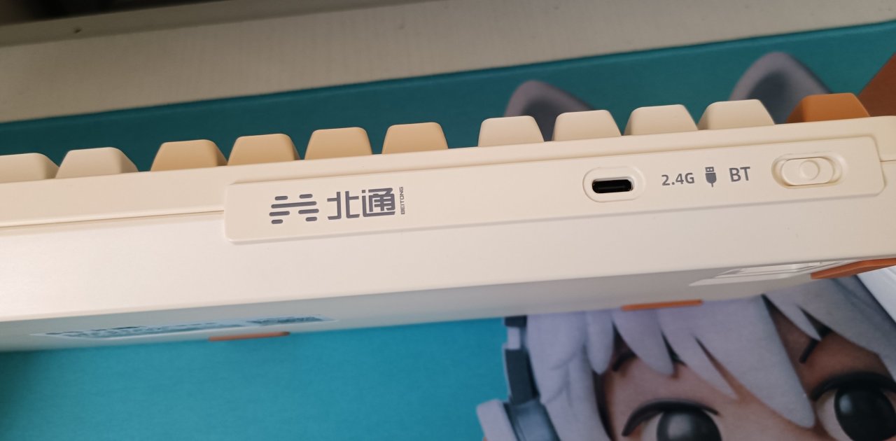 在鍵盤的手表騷話上方印有北通的logo,旁邊的便是充電c口和模式調(diào)節(jié)開關(guān)。