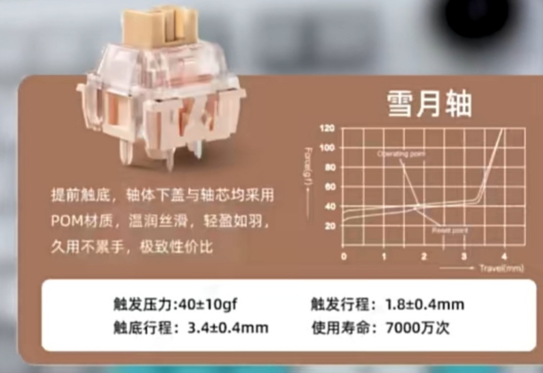 先講講這款鍵盤撘配的雪月軸吧,pom上蓋與軸芯,行程稍長,也是提前觸底,使用一周時(shí)間發(fā)現(xiàn)無論是碼字還是游戲表現(xiàn)都還不錯(cuò)。