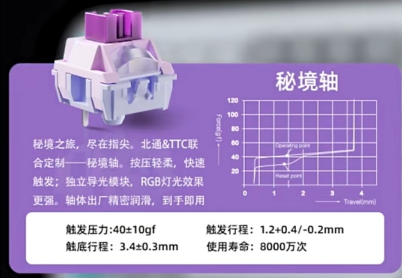這把鍵盤提供了兩種軸體,其中雪月軸是北通與ttc的定制款,分別是雪月軸和秘境軸。