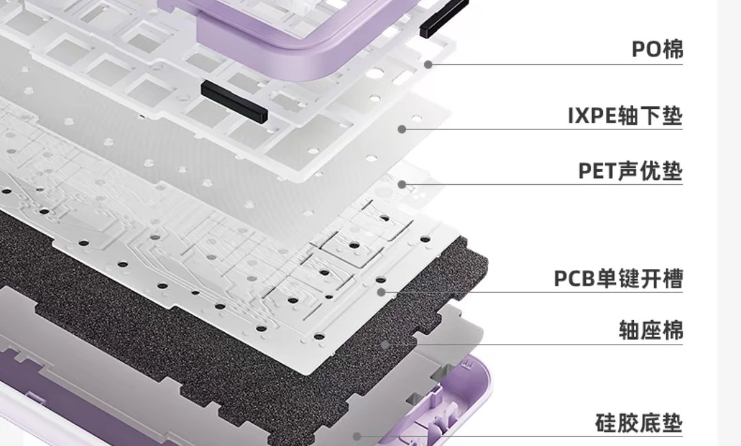 這把仍然采用當(dāng)下最火的gasket結(jié)構(gòu),4000毫安的電池。配置如下:po棉+ixpe軸下墊+pet聲優(yōu)墊+底棉+硅膠底墊。
