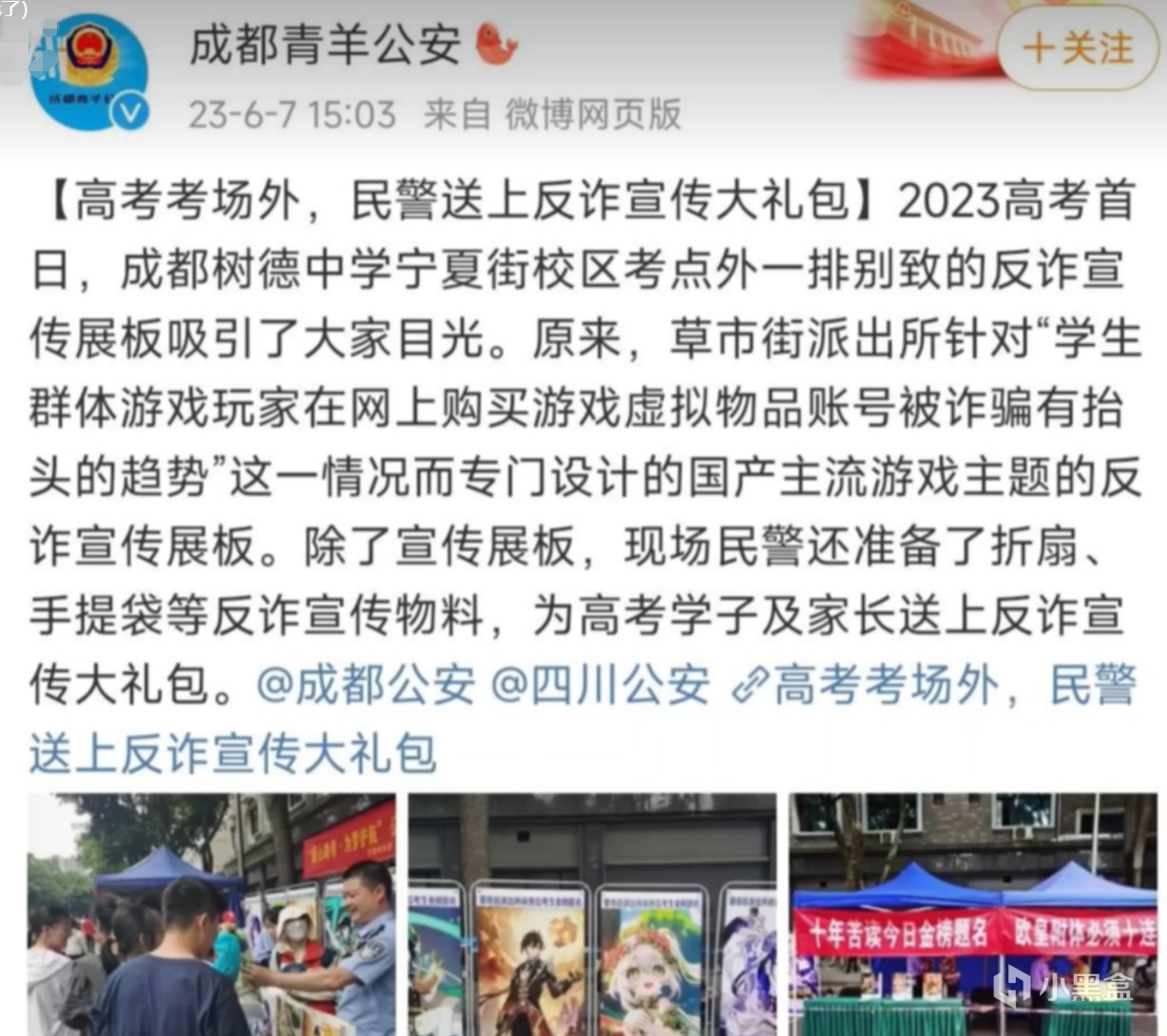 而這也并非原神第一次出現(xiàn)在高考考場外了,在2023年的時候,草市街派出所就針對“學(xué)生群體、游戲玩家在網(wǎng)上購買游戲虛擬物品、賬號被詐騙有抬頭趨勢”這一情況,以《原神》、《崩壞:星穹鐵道》等國產(chǎn)主流游戲為主題制作反詐宣傳展板,在成都樹德中學(xué)寧夏街校區(qū)的考點外樹立了一排別致的反詐宣傳展板。