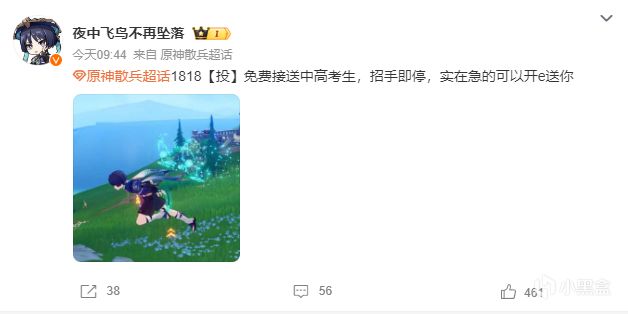每年高考期間,網(wǎng)上都會有不少人為高考學(xué)子們助威吶喊,今年也不例外。只不過原神上線以后,網(wǎng)友們祝福方式又多了一種。比如有不少網(wǎng)友都用原神角色為高考學(xué)子們祝福。比如這位“小重山OvO”就用小草神為考生們賜福,而另一位“夜中飛鳥不再墜落”則表示可以免費(fèi)接送高考生,還用散兵作比喻,可以說非常形象了。